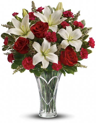 Straight from the heart. Ravishing red roses, delicate white lilies and our stunning, hand-cut glass vase are guaranteed to make this Valentine's Day one to remember.