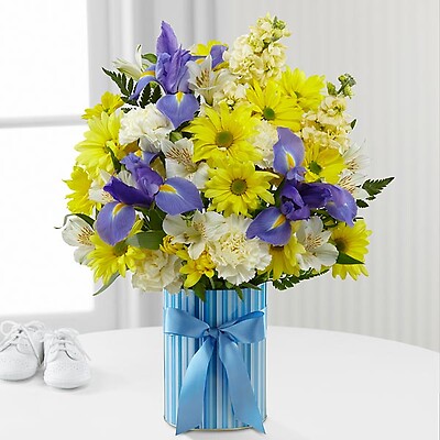 The Little Miracle™ Bouquet is the perfect way to welcome the newborn into the world and help the family celebrate on this most momentous occasion! Bringing together pale yellow carnations, blue iris, white Peruvian Lilies, yellow traditional daisies, fragrant pale yellow stock and lush greens, this stunning flower bouquet exudes warm wishes and sunlit cheer. Presented in a designer striped blue container accented with a satin blue ribbon on the front, this beautiful mixed flower arrangement will be a memorable gift for the new family.