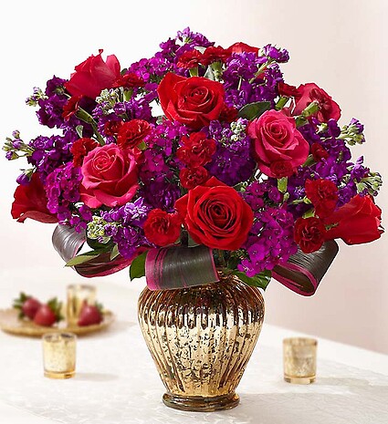 A beautiful celebration of color! Vivian Chang from 1-800-Flowers | Conroy’s in Los Angeles, California, filled this vibrant and luxurious bouquet with rich red and hot pink roses, burgundy mini carnations, purple dianthus and more inside a luxurious copper urn vase. Just one look will bring a bright smile to someone’s face!